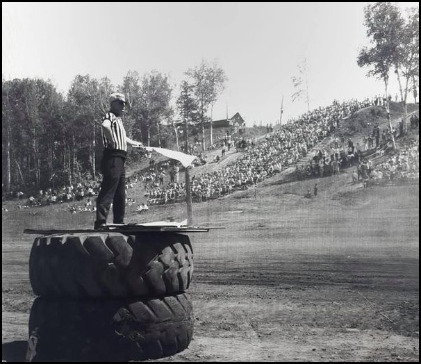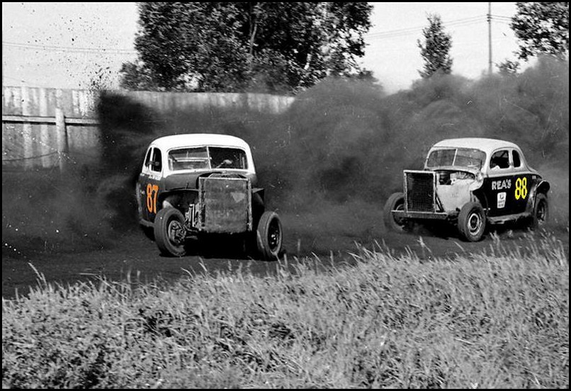 Canadian Lakehead Exhibition Photos: Pappy Fowler on the flag stand. A top runner at the CLE, and Riverview’s first flag man. Courtesy of Jeff Caldwell The Massaro brothers, Tony and Albert kicking up dust at the old Canadian Lakehead Exhibition half mile dirt track in about 1954. Courtesy of Dave Cano