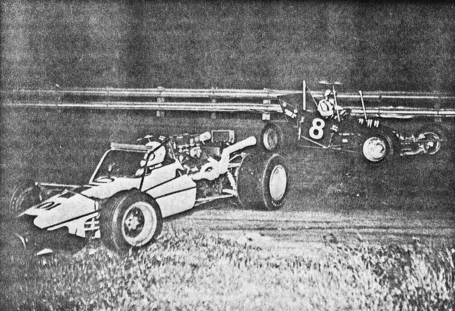 Barry Brush #01 and Merle Huyser #8 with Super Trouble at Delaware Speedway. Courtesy of Wheelspin News